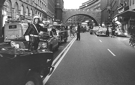 Poliția dirijează schimbarea traficului pe partea dreaptă pe strada Kungsgatan, Stockholm, 3 septembrie 1967, foto: Wikipedia