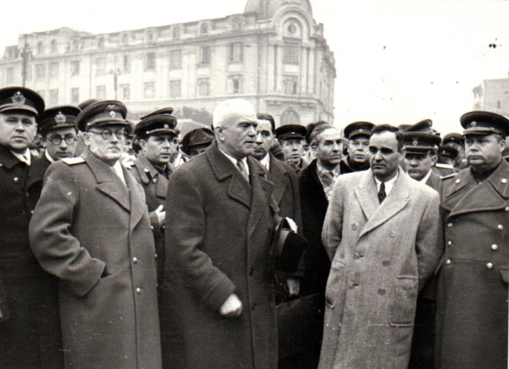 Groza, împreună cu Gheorghe Gheorghiu-Dej (centru), Gheorghe Tătărescu, Petre Constantinescu-Iași, Andrey Vyshinsky și Ivan Susaikov la gara de Nord din București, 14 martie 1945, foto: Wikipedia