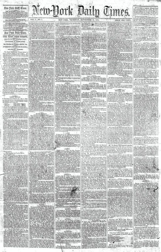 Prima ediție a ziarului american The New York Times sub titlul „The New York Daily Times”, sursa foto: Wikipedia