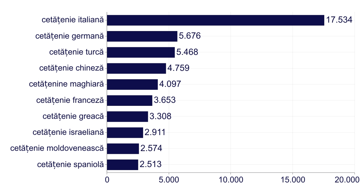 Cei mai mulți dintre administratorii străini sunt cetățeni italieni, prezenți în 17.534 de firme. Pe locul 2 sunt administratorii germani, urmați de cei cu cetățenie turcă, chineză și maghiară. Pe locul 9 sunt moldovenii, prezenți în 2.574 de firme și spaniolii, care administrează 2.513 firme.