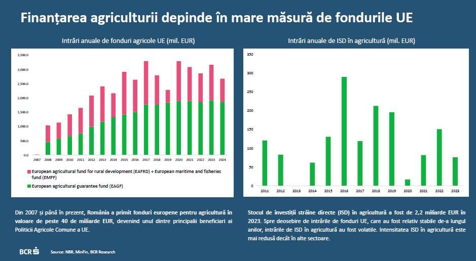 Spre deosebire de fondurile UE, care au fost relativ stabile de-a lungul anilor, intrările de ISD în agricultură au fost volatile, după cum se arată într-o analiză realizată de BCR.