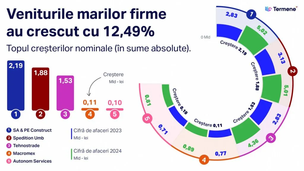 - SA & PE Construct SRL – Creștere de 2,19 miliarde de lei (de la 2,83 miliarde de lei în 2023 la 5,02 miliarde de lei în 2024).