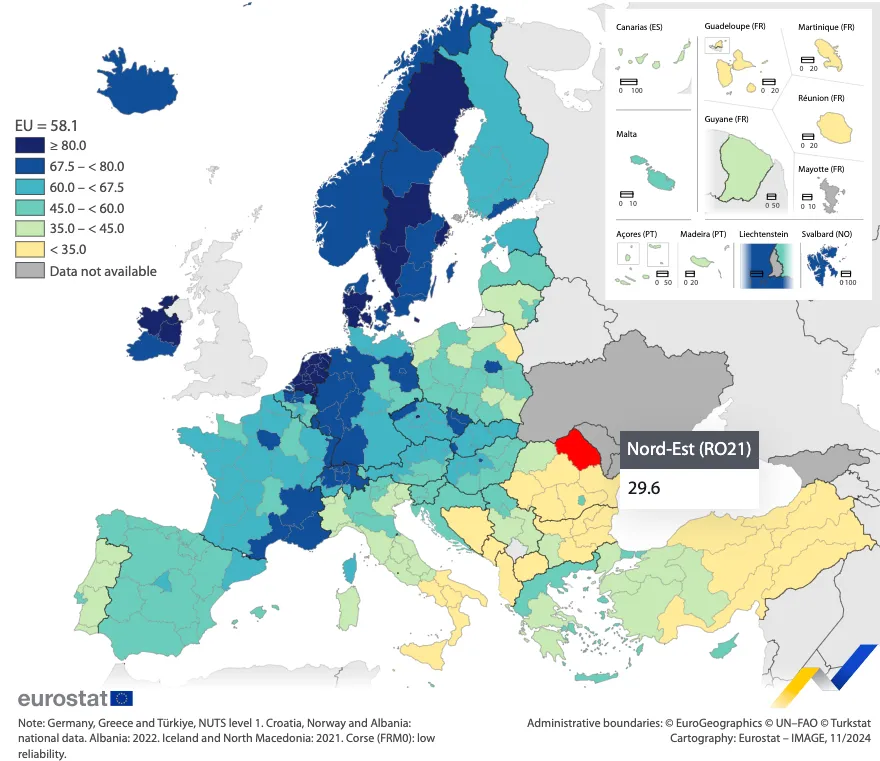În analiza europeană realizată de Eurostat, procentajul a fost mai mare decât media UE (58,1%) în fiecare regiune (la nivelul 2 al nomenclaturii unităților teritoriale pentru statistică (NUTS 2) din Cehia, Danemarca, Irlanda, Franța (cu excepția regiunilor ultraperiferice), Țările de Jos, Slovacia, Finlanda, Suedia, Estonia, Luxemburg și Malta.