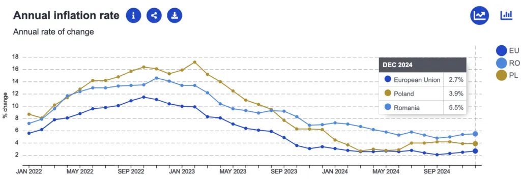 Statul polonez are o inflație mai mică în puncte procentuale cu 1,6 față de cea din România. În țara noastră inflația a fost în luna decembrie la 5,5% iar în Polonia de doar 3,9%. Media UE a fost de 2,7%.
