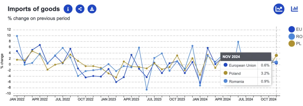 România a avut o creștere a importurilor de doar 0,9% în noiembrie față de luna precedentă. În schimb, în Polonia a importurile au crescut cu 3,2%.