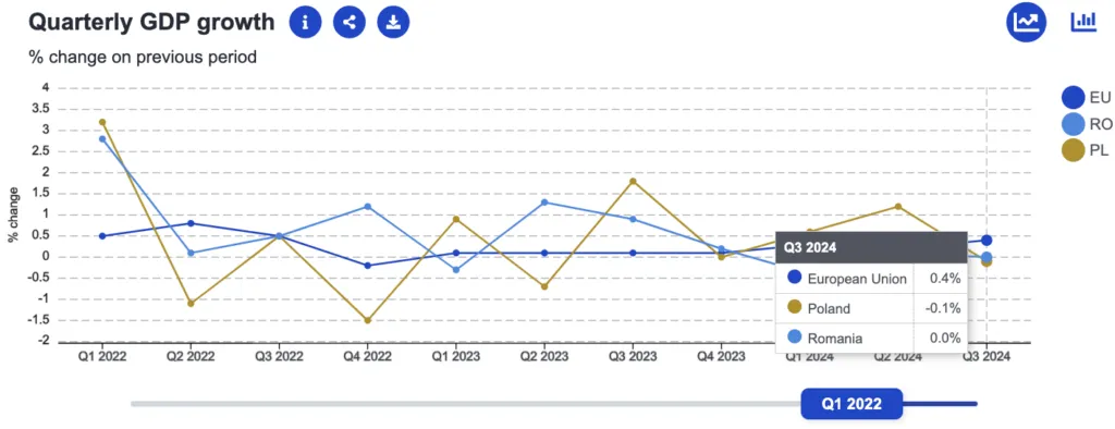 România care a avut parte de o stagnare a PIB-ului propriu în trimestrul al treilea din 2024. În Polonia, s-a înregistrat o scădere de 0,1%.