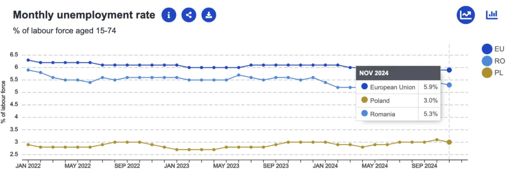 Polonia are o rată a șomajului cu 2,3 procente mai mică față de cea din România. În țara noastră, în luna noiembrie, rata șomajului a fost de 5,3%, iar în Polonia de 3,0%. De notat că ambele țări au un șomaj mai mic decât media tuturor state membre ale UE.