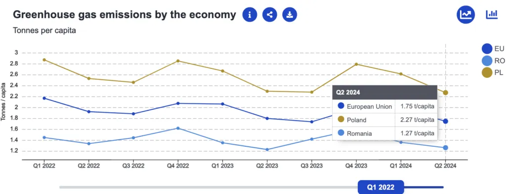 România are aerul mai curat în ceea ce privește gazele de seră emise de producția economică. Economia din Polonia a poluat aproape dublu față de România, fiind peste media UE.