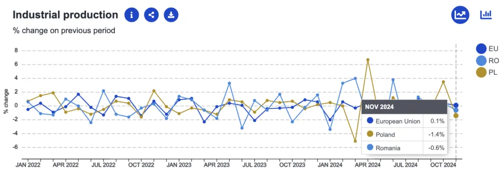 România a înregistrat în luna noiembrie o scădere cu 0,6% a producției industriale. În Polonia scăderea a fost mai accentuată, de 1,4%. Toate statele membre UE au raportat o creștere economică de 0,1%.