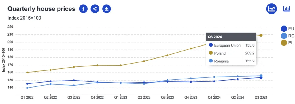 În România, din 2025, prețul caselor a crescut doar cu 155,1%. În schimb, în Poloia, prețul unei case s-a dublat, fiind o creștere de 209,2%.