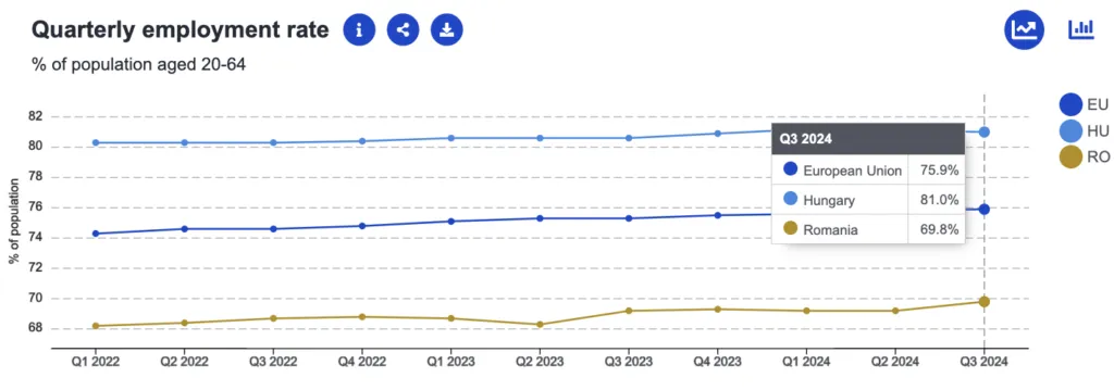 Ungaria are o rată de angajare a populației de 81%, mai mare decât media UE. În România, doar 69,8% din populație avea un loc de muncă.