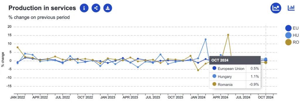 Țara vecină a înregistrat, în luna octombrie, o creștere a producției serviciilor cu 1,1%. În România s-a înregistrat o scădere de 0,9%.