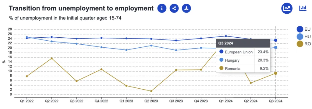 În trimestrul al treilea din 2024, 20,3% din persoanele șomere s-au angajat în Ungaria. În România, procentul a fost de doar 9,2 puncte procentuale. Cele două state sunt sub media UE.