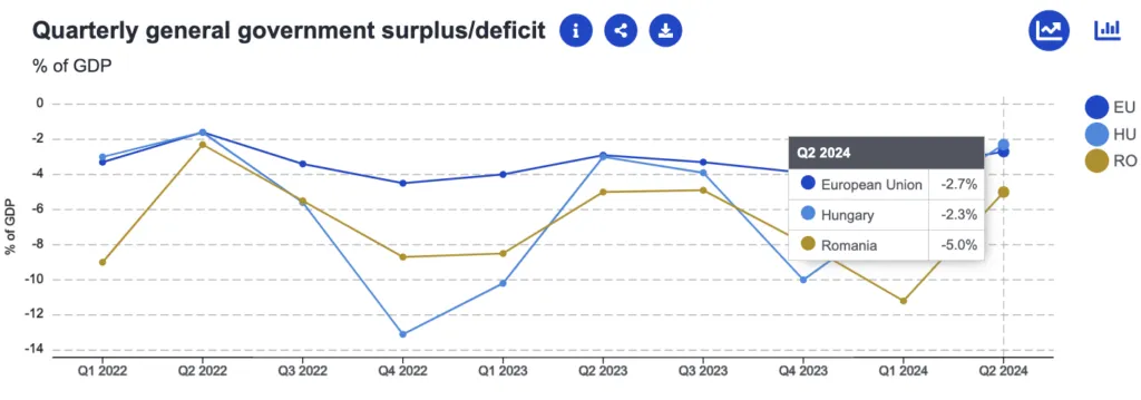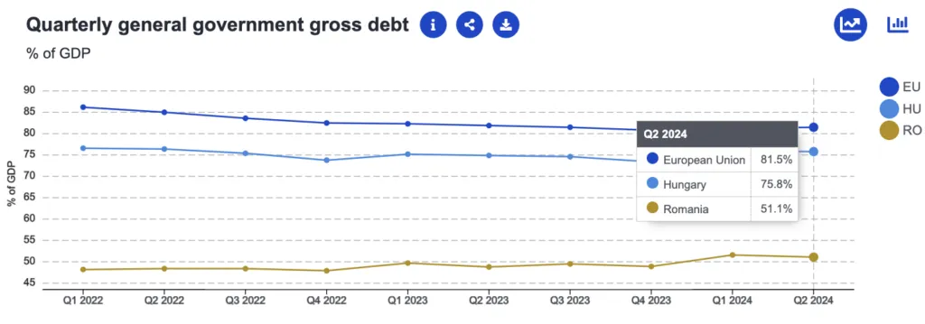 Asta pentru că România avea în trimestrul al doilea din 2024 o datorie guvernamentală de 51,1% din propriul PIB. Ungaria are datorii de 75,8% din PIB. De altfel, țara noastră stă bine și în ceea ce privește media europeană.