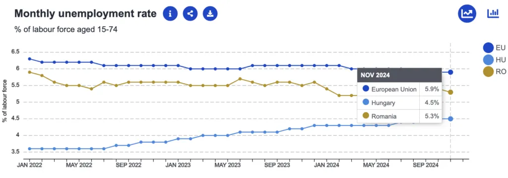 Ungaria are o rată a șomajului cu 0,8 procente mai mică față de cea din România. În țara noastră, în luna noiembrie, rata șomajului a fost de 5,3%, iar în Ungaria de 4,5%. De notat că ambele țări au un șomaj mai mic decât media tuturor state membre ale UE.