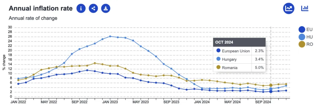 Țara vecin are o inflație mai mică în puncte procentuale cu 1,6 față de România. În țara noastră inflația a fost în luna octombrie la 5% iar în Ungaria de doar 3,4%. Media UE a fost de 2,3%.