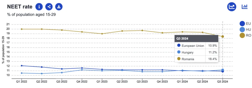 Ungaria are un procent mai mic al tinerilor care nu studiază sau nu au loc de muncă față de România. În Ungaria, dintre tinerii între 15 și 29 de ani, doar 11,2% nu aveau loc de muncă sau nu studiau în trimestrul al treilea din 2024.