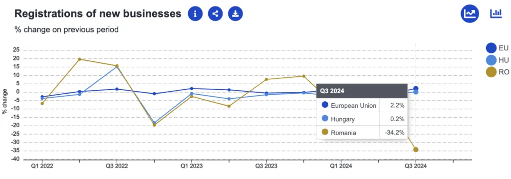 Țara vecină o scădere a înregistrărilor de noi companii de 0,2%. În România scăderea este una drastică, de 34,2%. Statele membre UE au înregistrat o creștere de 2,2%.