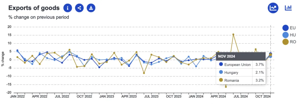 Țară noastră a înregistrat o creștere a exporturilor de 3,2%. Ungaria a exportat mai mult cu 2,1%. Media UE este de 3,7%.