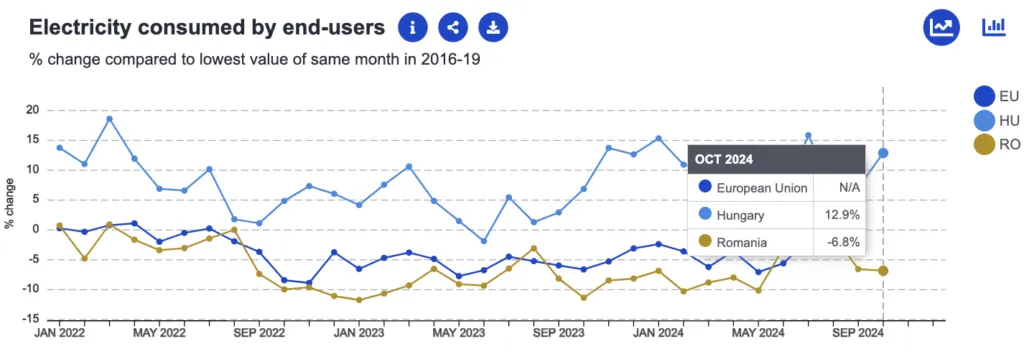 România are, în luna octombrie 2024, o scădere a consumului de energie cu 6,8% față de perioada 2016-2019. Această scădere semnifică și o încetinire a producției industriale.Ungaria înregistrează în schimb o creștere a consumului de energie cu 12.9%.