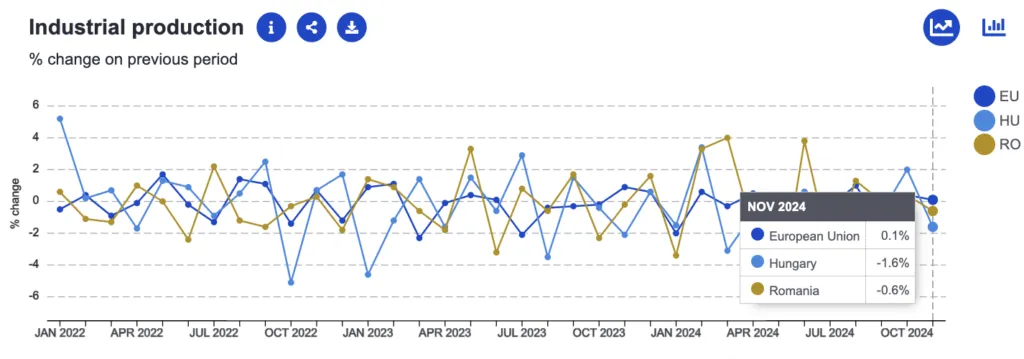 România a înregistrat în luna noiembrie o scădere cu 0,6% a producției industriale. În Ungaria scăderea a fost mai accentuată, de 1,6%. Toate statele membre UE au raportat o creștere economică de 0,1%.