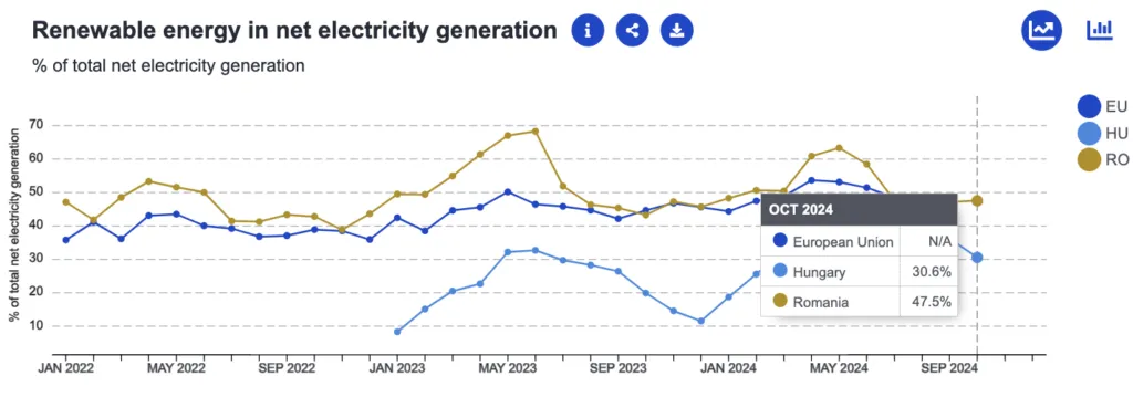 În luna octombrie 2024, rata de energie verde produsă în România era de 47,5%. În Ungaria, rata a fost de 30,6%.