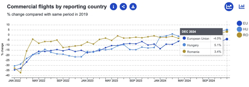 Țara vecină a înregistrat pentru luna decembrie 2024 o creștere a numărului de zboruri ale pasagerilor cu 5,1% față de aceeași lună din 2019, perioada la care s-a raportat Eurostat. România a avut o creștere de doar 3,4%. De menționat că media UE a fost însă negativă, unde s-a înregistrat o scădere de 4%.