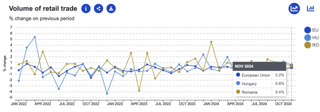 România a înregistrat o creștere a comerțului cu amănuntul de 0,4% în luna noiembrie față de luna precedentă. Ungaria a avut o creștere de 0,6%.