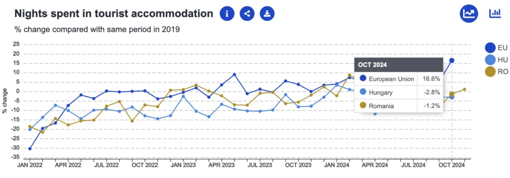 Pentru luna octombrie 2024, numărul nopților de cazare din România a fost mai mic cu 1,2% față de aceeași perioadă din 2019, luată ca reper de Eurostat. În schimb, în Ungara scăderea a fost de 2,8%.