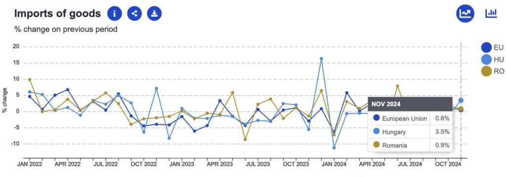 România a avut o creștere a importurilor de doar 0,9% în noiembrie față de luna precedentă. În schimb, în Ungaria importurile au crescut cu 3,5%.