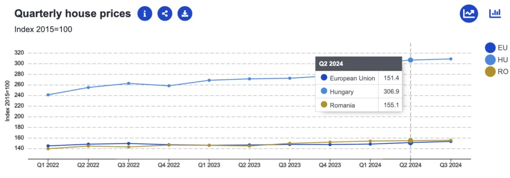 În România, din 2025, prețul caselor a crescut doar cu 155,1%. În schimb, în Ungaria, prețul unei case s-a triplat, fiind o creștere de 306,9%.