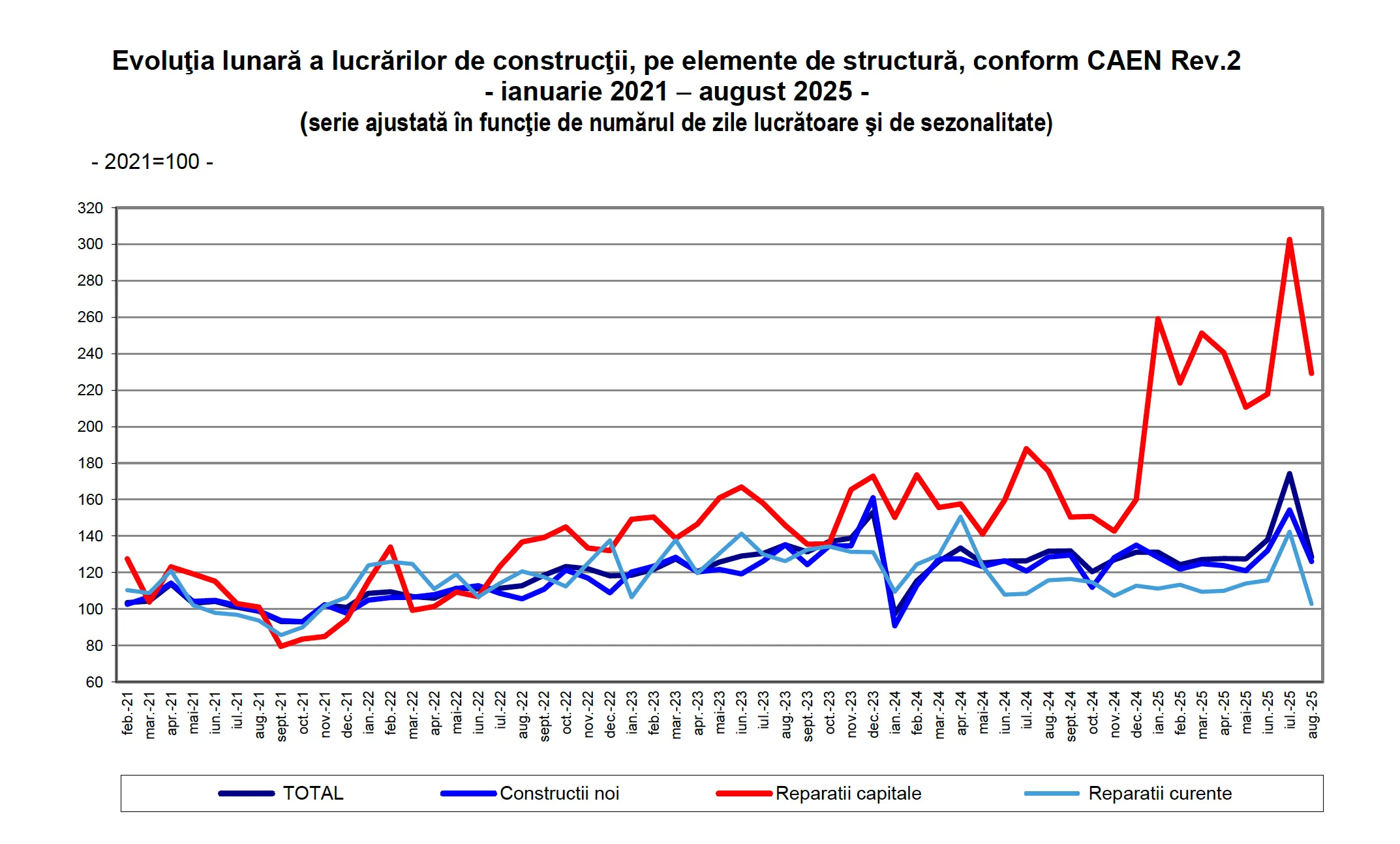 Evaluând primul segment al anului, segmentul reparațiilor capitale a fost principalul motor, avansând cu +50,4% (serie brută) și +48,7% (ajustat) în perioada ianuarie-august 2025 față de 2024. Construcțiile noi au crescut solid cu +7,0% (brut) și +7,8% (ajustat), reflectând investiții susținute în infrastructură și imobiliare. Însă întreținerea și reparațiile curente au scăzut cu -2,7% (brut) și -5,2% (ajustat), indicând posibil amânări sau bugete reduse pentru aceste categorii.