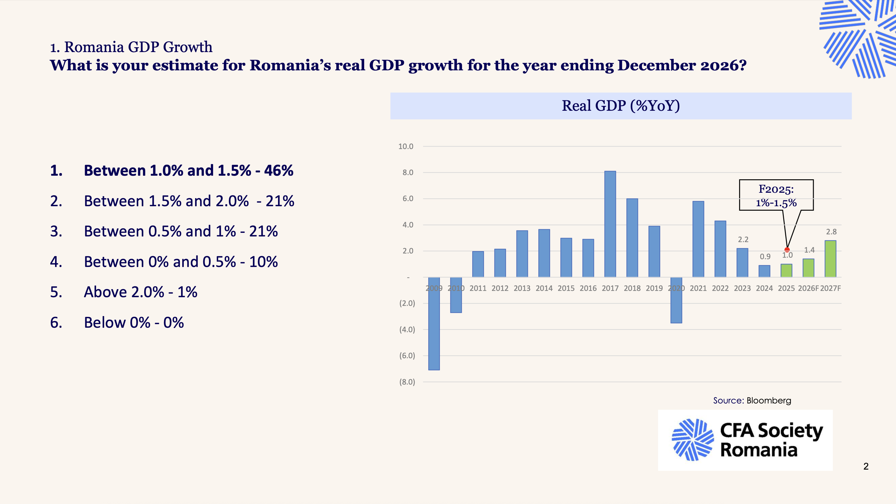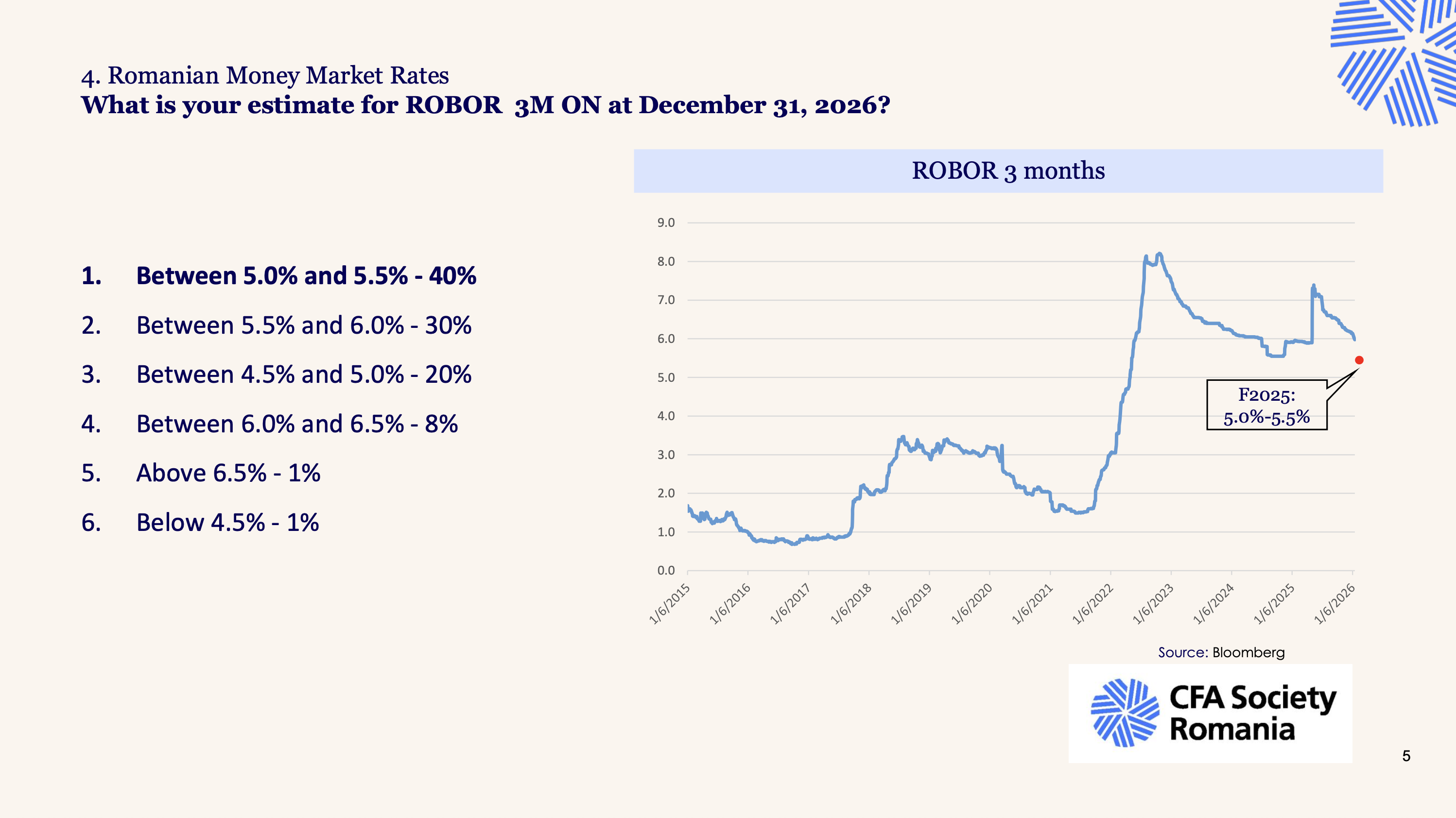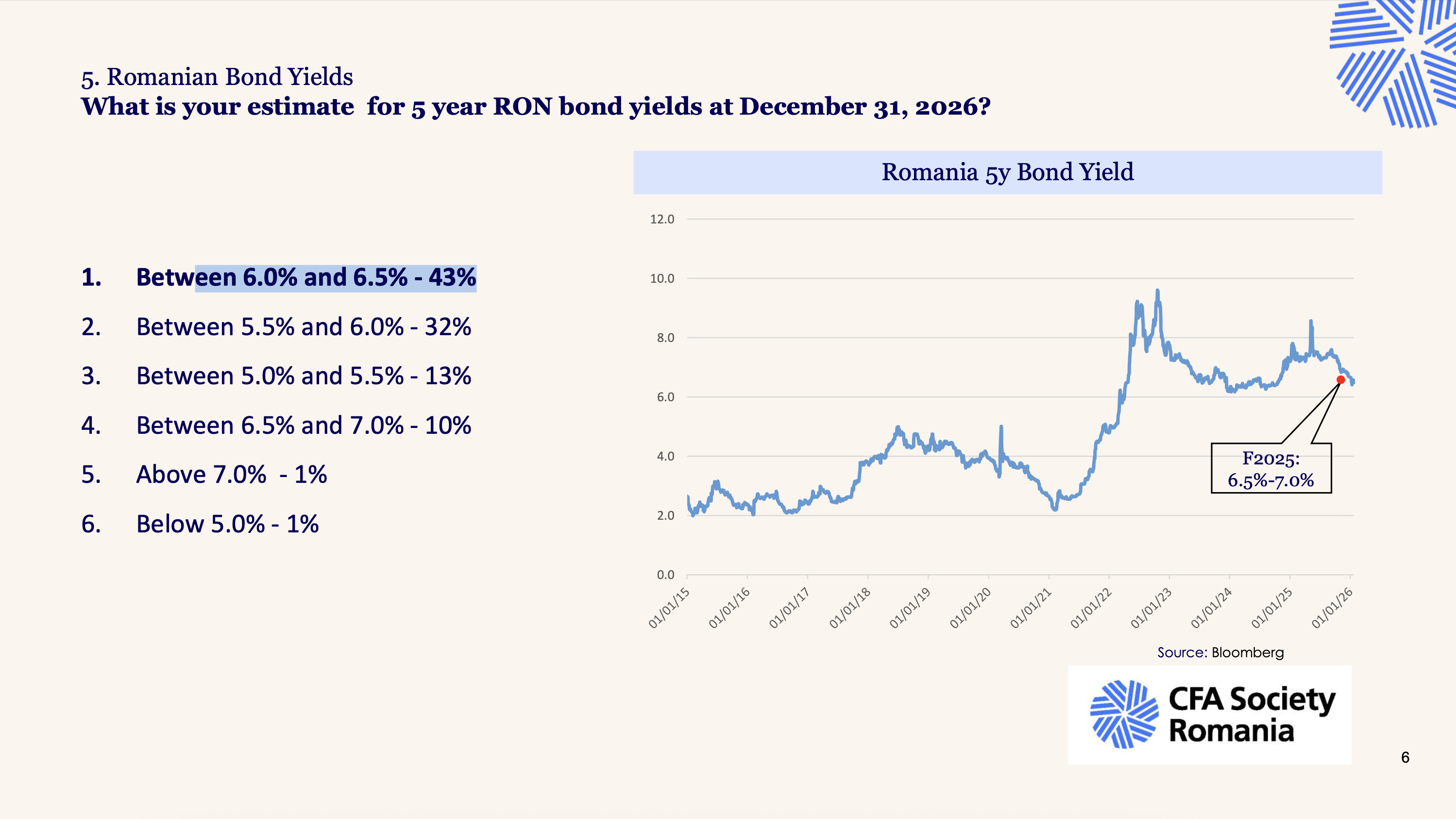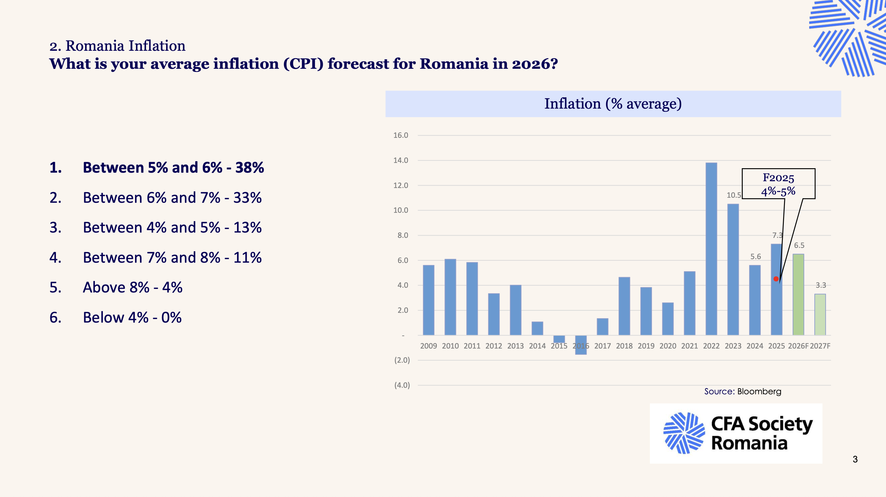 Desfășurat sub tema „Direcția strategică a României pentru următorii 10 ani”, CFA Forecast Dinner a luat pulsul a peste 140 de participanți din industria financiară pentru a vedea care sunt așteptările în piață pentru anul 2026.