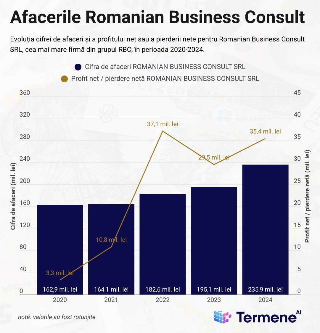 Compania Romanian Business Consult SRL a avut afaceri de 235,9 mil. lei în 2024, în creștere cu 20% față de anul anterior, un profit net de 35,4 mil. lei, în creștere cu 19%, respectiv 257 de angajați, în creștere cu 3%. În prezent, acționarul companiei este entitatea cipriotă Bluekit Limited.