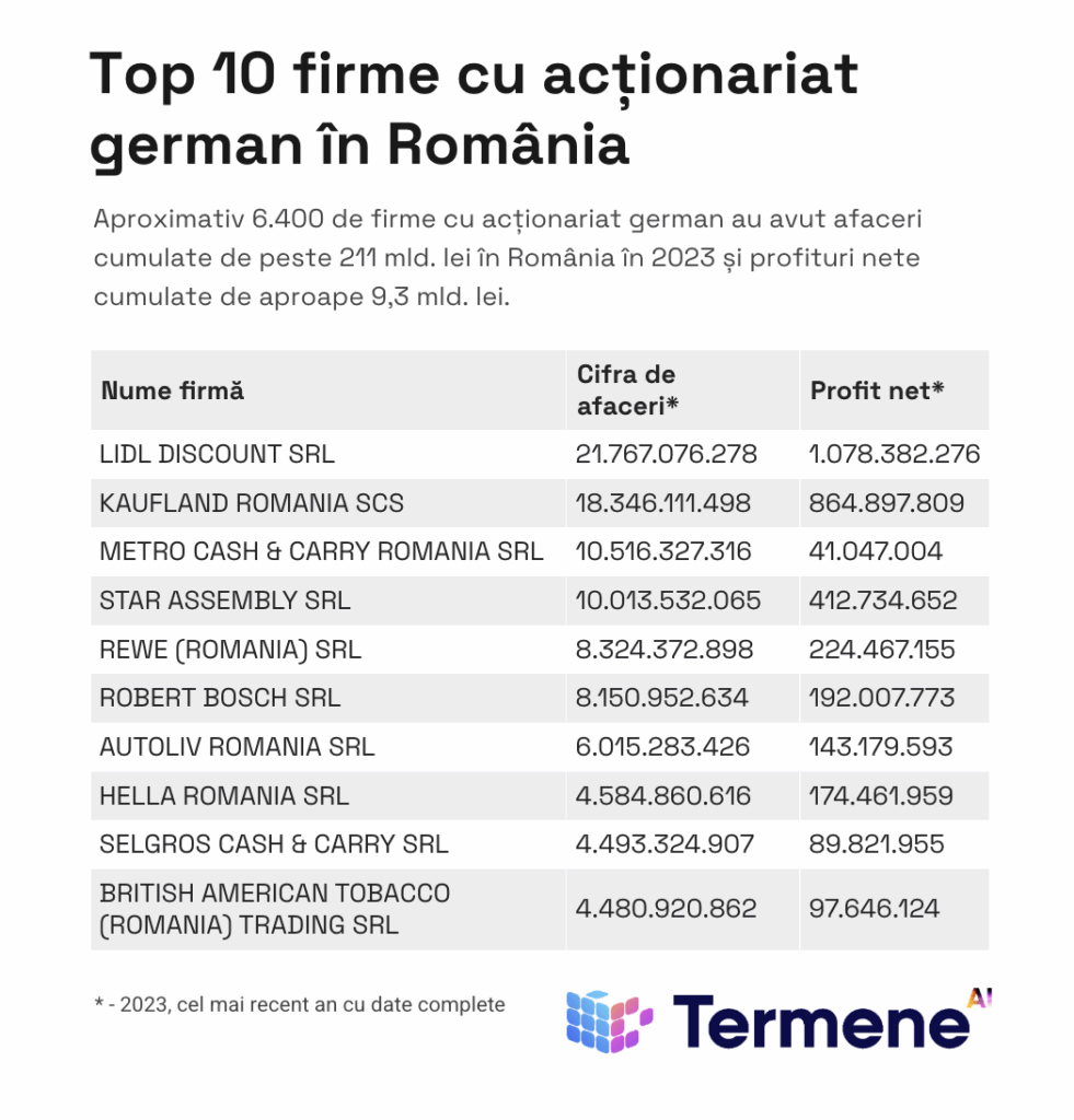 În economia românească sunt aproximativ 6.400 de firme cu acționariat german, care au totalizat afaceri de peste 211 mld. lei în anul 2023, cel mai recent an cu date complete, în creștere de la peste 199 mld. lei în anul 2022., conform Termene Pasp.