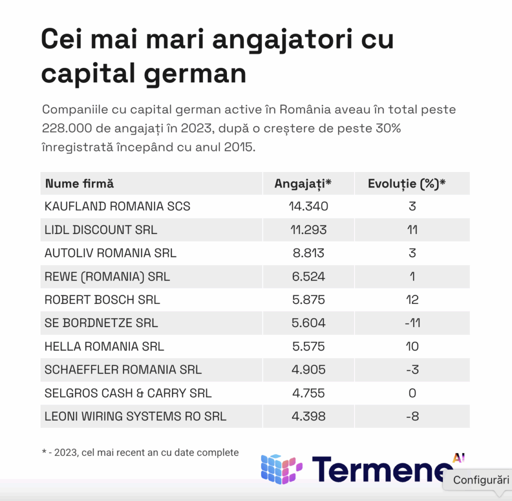 Cel mai mare angajator cu capital german din piața locală este Kaufland România, cu peste 14.300 de oameni în 2023, în creștere cu 3% față de anul anterior, iar pe locul doi se află Lidl Discount, al doilea braț al grupului Schwarz în România, cu aproape 11.300 de angajați în 2023, în creștere cu 11% față de 2022.