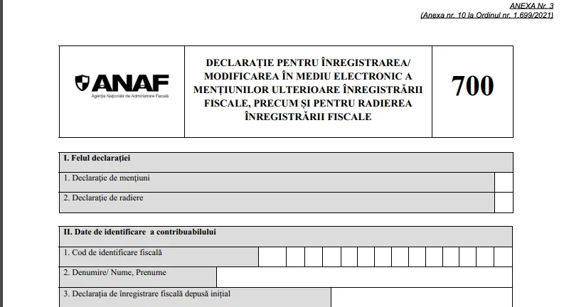 Formularul 700 este destinat persoanelor juridice și altor contribuabili care trebuie să efectueze modificări în vectorul fiscal exclusiv în format electronic. Acesta este utilizat pentru:
