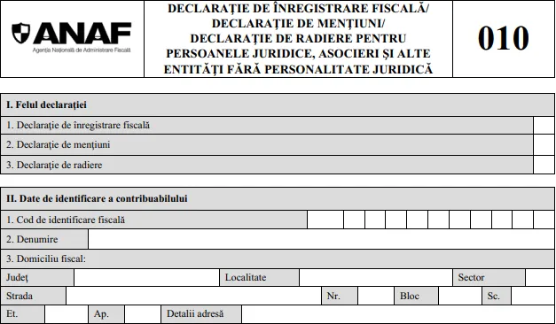 - La anexa nr. 1, formularul „Declarație de înregistrare fiscală/Declarație de mențiuni/Declarație de radiere pentru persoanele juridice, asocieri și alte entități fără personalitate juridică” (010) se modifică și se înlocuiește cu formularul din anexa nr. 1 la prezentul ordin”.