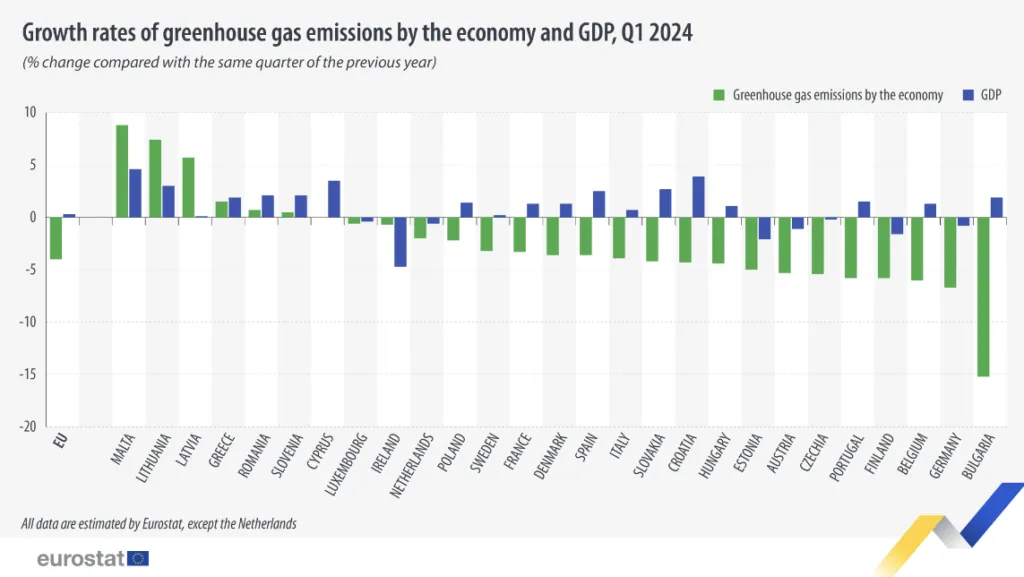 Se estimează că, în primul trimestru al anului 2024, emisiile de gaze cu efect de seră au scăzut în 20 de țări ale UE, în comparație cu același trimestru al anului 2023. Cele mai mari reduceri ale emisiilor de gaze cu efect de seră sunt estimate pentru Bulgaria (-15,2%), Germania (-6,7%) și Belgia (-6,0%).