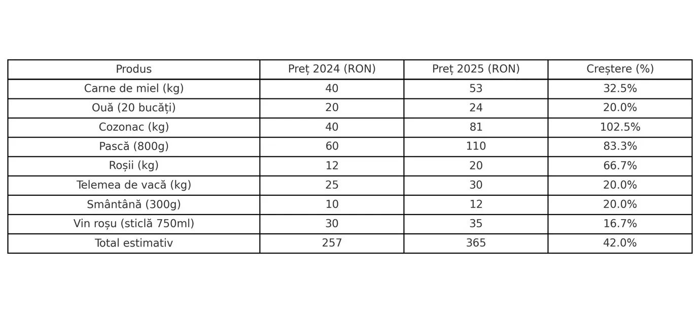 Comparativ 2024–2025: Costuri pentru masa tradițională de Paști: