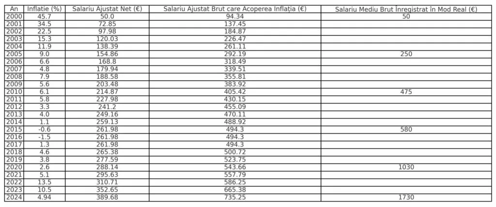 Inflația dintr-un an a fost adăugată la salariul mediu net din anul respectiv și s-a obținut salariul net ajustat care acoperea inflația. Apoi, la venitul salarial net s-au adăugat contribuțiile pe forța de muncă și s-a obținut salariul mediu brut ajustat care acoperea inflația.