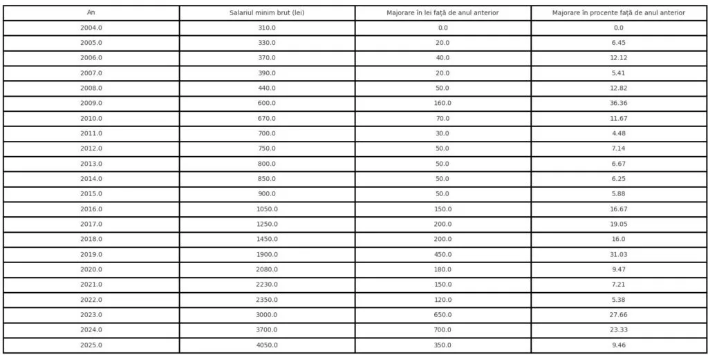 Chiar și așa, majorarea din 2025 este tot atât cât s-a indexat salariul minim brut între 2004 și 2010.
