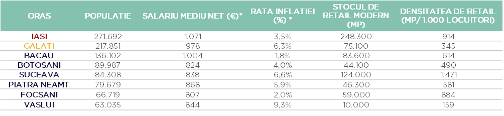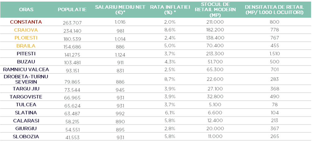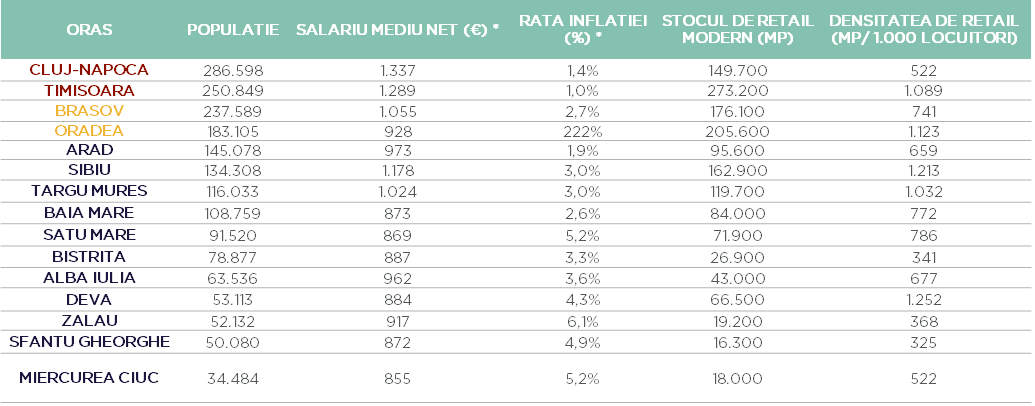 La nivel de oraș, localitățile cu cea mai mare densitate de spații comerciale sunt Pitești (1.510 mp/ 1.000 locuitori), Suceava (1.471 mp/ 1.000 locuitori), Deva (1.252 mp/ 1.000 locuitori), Sibiu (1.213 mp/ 1.000 locuitori), Oradea (1.123 mp/ 1.000 locuitori) – orașe cu până la 150.000 de locuitori și Timișoara (1.089 mp/ 1.000 de locuitori) – oraș primar cu o populație de peste 250.000 de locuitori.