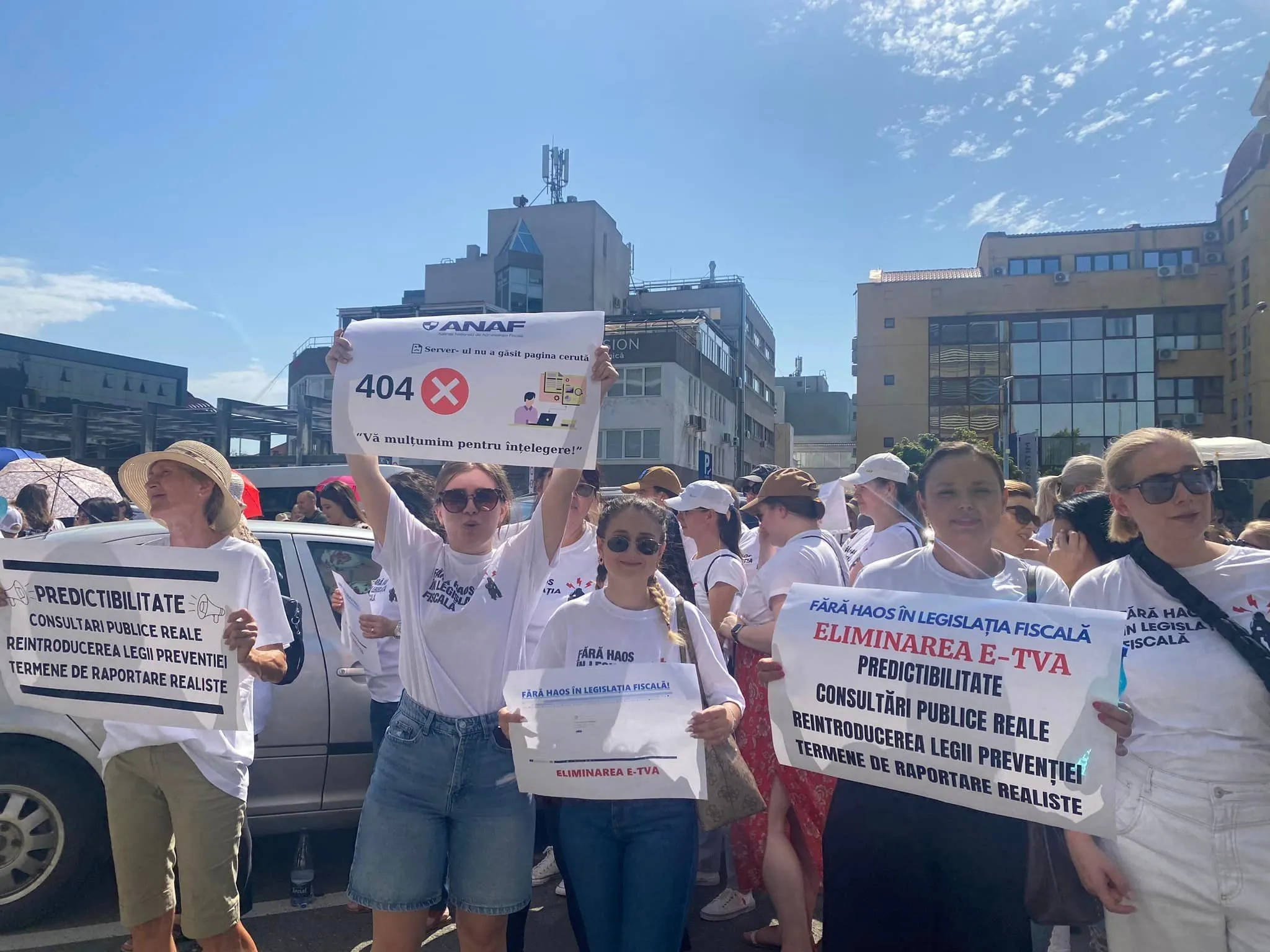 Luni, experții contabili au protestat împotriva e-TVA, e-Factura dar și împotriva lipsei de predictibilitate a legislației fiscale, motto-ul mitingului fiind ”Fără hos în legislația fiscală”. Orașele în care au fost organizate proteste au fost București, Oradea, Iași, Timișoara, Bistrița, Constanța etc.