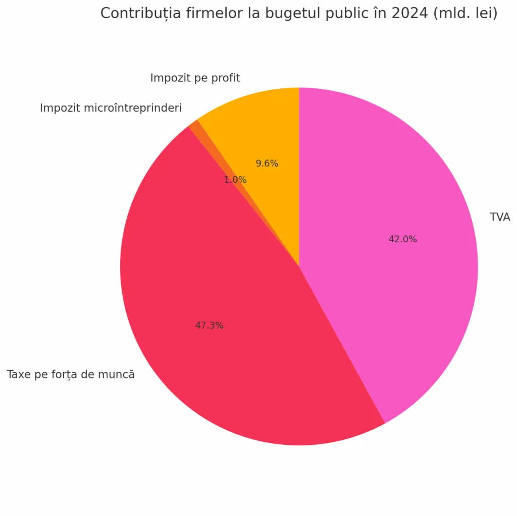 Așadar, firmele au susținut, conform unui calcul estimativ, bugetul public în 2024 — prin impozit pe profit (8,65 miliarde de lei), pe cifra de afaceri pentru micro (0,91 miliarde de lei), taxe pe forța de muncă (42,5 miliarde de lei) și TVA (37,7 miliarde de lei) — cu aproximativ 89,76 miliarde de lei.