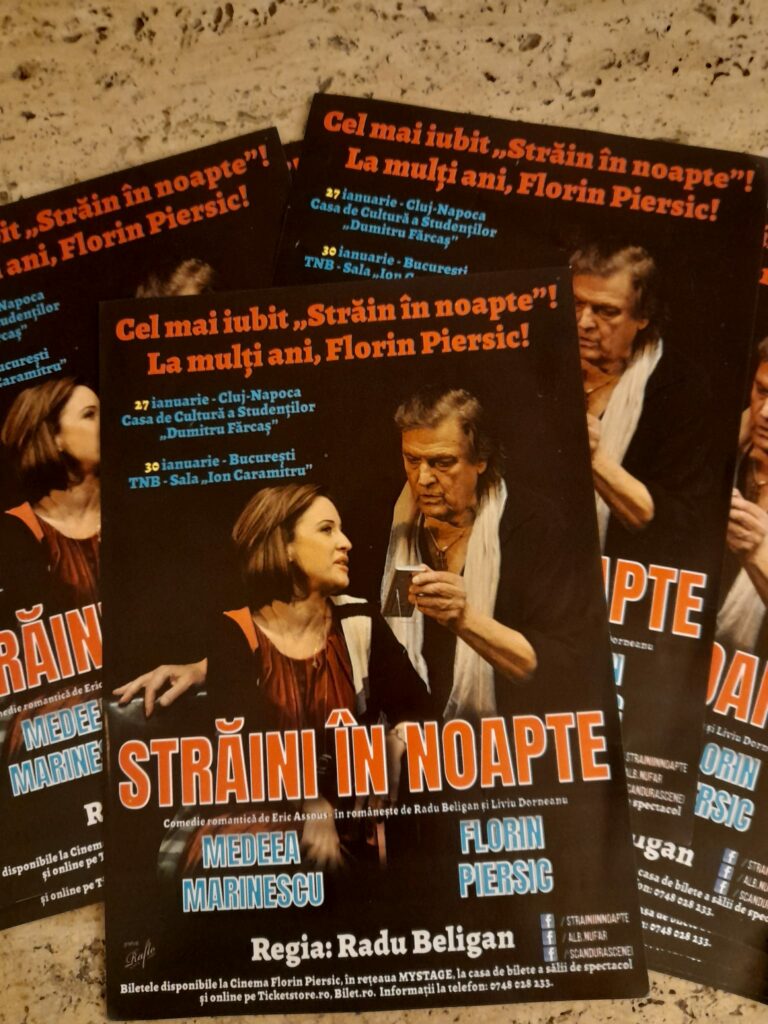 Înainte de spectacolul de la Cluj-Napoca, din 8 aprilie, piesa „Străini în noapte” a fost jucată și pe scena Teatrului Național București. La acea vreme, actorul anunța că a jucat piesa de 1.280 de ori.