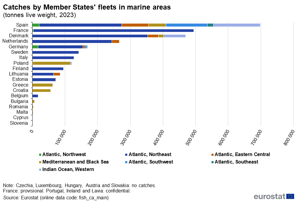 Spania și Portugalia sunt singurele țări care au realizat capturi în toate cele șapte zone marine acoperite de statisticile UE.