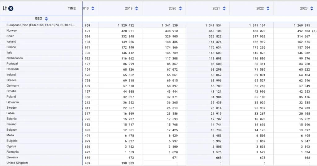 - Spania: Valoarea cea mai mare, reflectând specii valoroase precum tonul, merluciul, peștele spadă și calmarul. Creștere semnificativă (+33,8%) la 2,7 miliarde EUR în 2023.