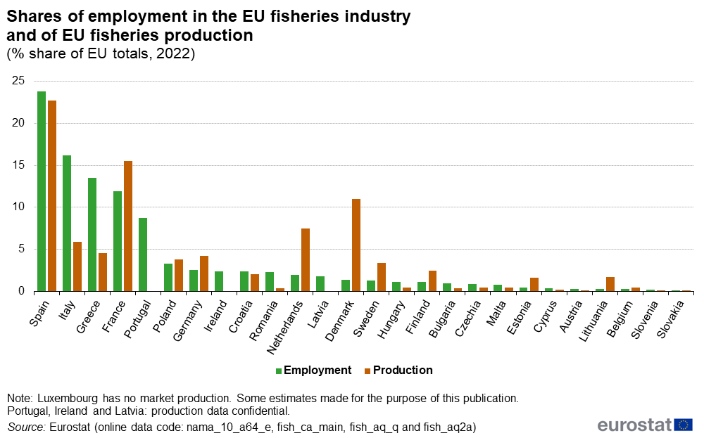 Se estimează că aproximativ 157.000 de persoane erau angajate în industria primară a pescuitului din UE în 2022, dintre care aproximativ o treime lucrau în sub-sectorul acvaculturii. Aproximativ un sfert din locurile de muncă în industria primară a pescuitului din UE în 2022 erau în Spania. De fapt, trei sferturi din angajările în acest sector erau concentrate în doar cinci țări: Spania, Italia, Grecia, Franța și Portugalia.