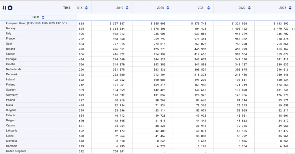 Captura totală a UE în 2023 a fost estimată la 3,3 milioane de tone în greutate vie, un nou minim, mult sub cele 4,6 milioane de tone înregistrate în 2017 și 2018 și mult mai mică decât cele 5,9 milioane de tone capturate în 2001.